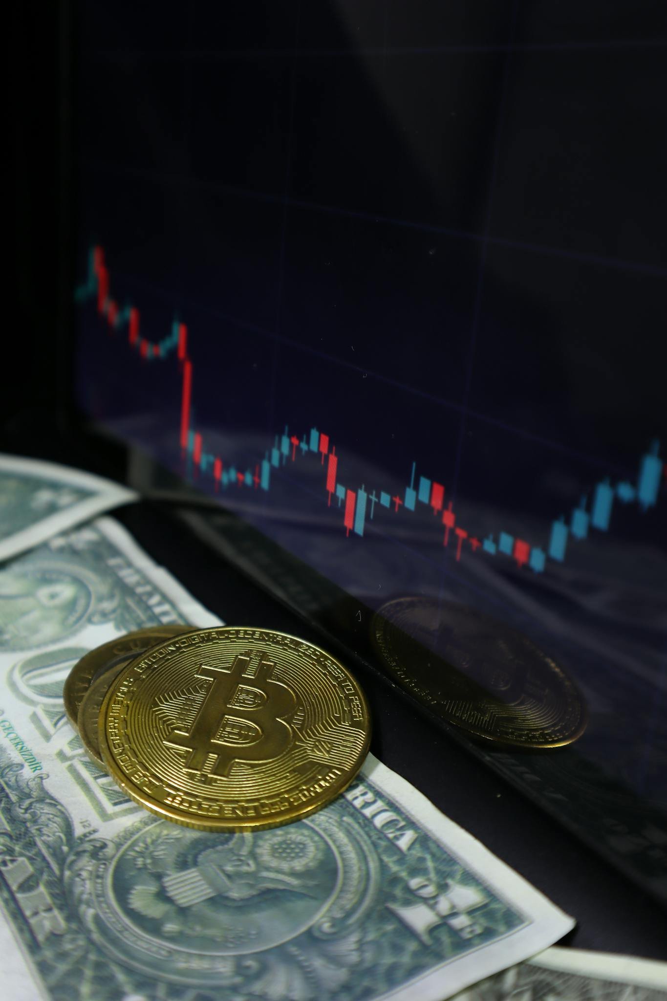 Bitcoin coin with a downward trend graph on a yellow sticky note, symbolizing market decline.